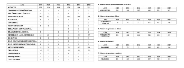Por categorías profesionales, la enfermería fue la profesión más afectada con 248 agresiones, seguida de la profesión médica con 215, los auxiliares de enfermería con 106, el personal administrativo con 59 y los celadores con 22 casos.