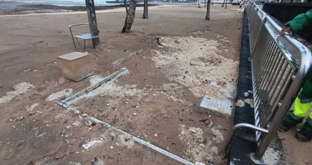 El fuerte oleaje registrado durante la madrugada en Arrecife como consecuencia de la borrasca Therese ha provocado importantes daños en distintos puntos del litoral de la capital, afectando a playas, paseos marítimos y espacios públicos situados junto al mar.
