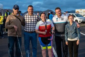 Acto seguido, las autoridades presentes, entre ellas el alcalde de Yaiza, Óscar Noda, y el concejal de deportes, Ángel Lago, así como la edil de Seguridad y Emergencias, Beatriz Vazquez, y la seleccionadora nacional de paraciclismo, Begoña Luis Pérez, impusieron las medallas y trofeos, además de los maillot con los que al día siguiente, atendiendo a la normativa federativa, deberían correr como líderes de la Copa de España.