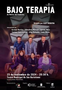 Además, el Teatro municipal de San Bartolomé será el escenario para representar la obra Bajo Terapia, del escritor Matías del Federico y llevada a cabo por la compañía Regañiza SCP. Tendrá lugar el 25 de noviembre, a las 20:30 horas y abordará las distintas relaciones de tres parejas durante una sesión grupal, hasta llegar a límites insospechados.