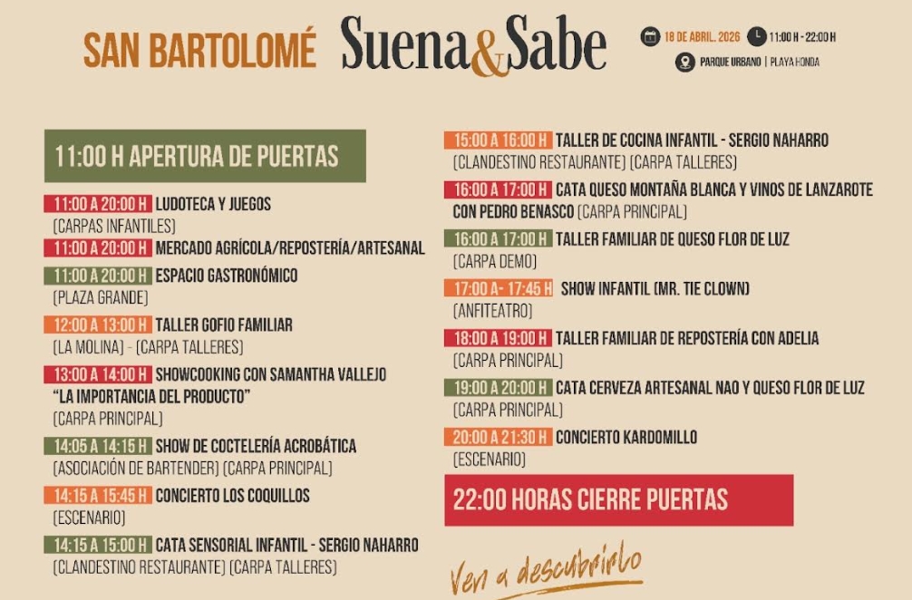 El Ayuntamiento de San Bartolomé organiza este sábado, 18 de abril, una nueva edición de ‘Suena y Sabe’, una jornada festiva que combinará gastronomía local, música en directo y actividades para todos los públicos en el Parque Urbano de Playa Honda.