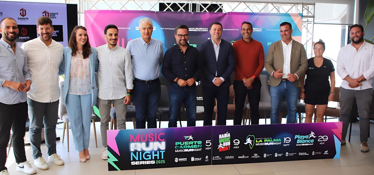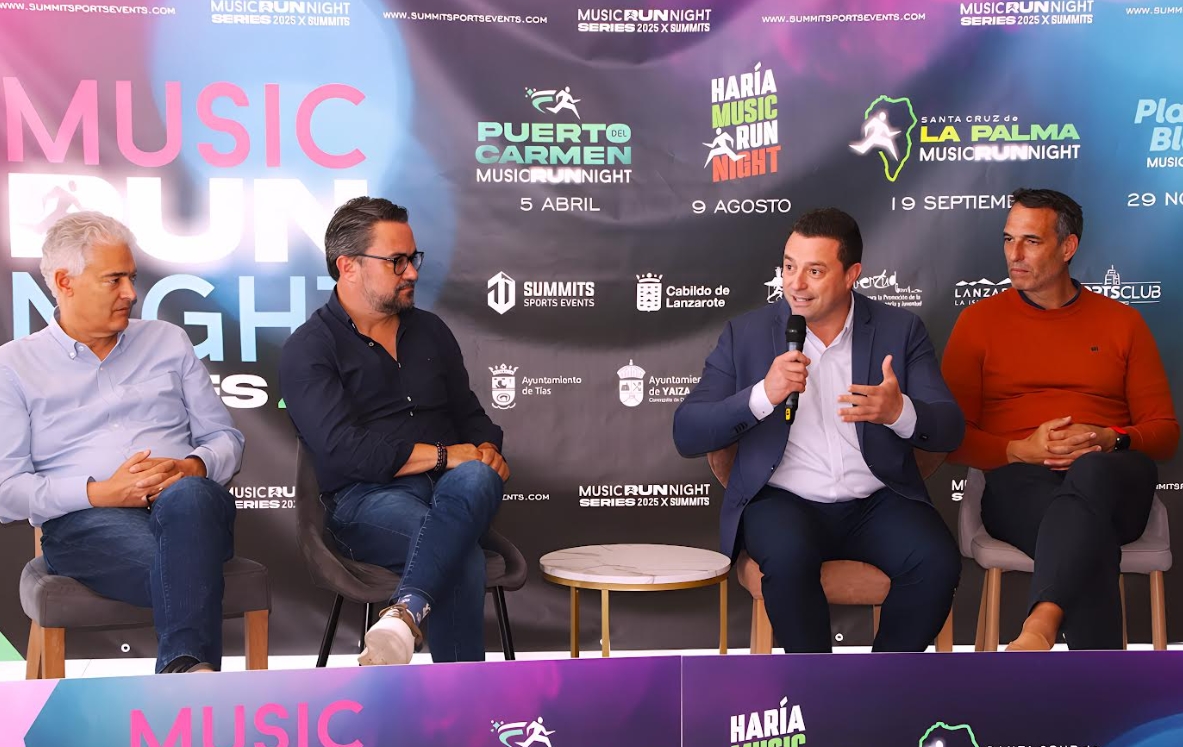 La localidad turística de Playa Blanca, en Yaiza, celebró en 2021 la primera Music Run Night y solo cuatro años después el nombre y concepto de esta carrera popular aparece implantada en Puerto del Carmen, núcleo turístico de Tías; Haría, y fuera de Lanzarote, en Santa Cruz de La Palma, capital de la Isla Bonita, así, sus cuatro alcaldes, Óscar Noda (Yaiza), José Juan Cruz (Tías), Alfredo Villalba (Haría) y Asier Antona (Santa Cruz de La Palma) presentaron este viernes en Soprts Club Puerto Calero, junto a concejales de deportes y de turismo y el equipo técnico organizador, el calendario de la Music Run Night Series 2025, que llega con más sorpresas y 1.900 euros en premios en metálico totalizando las cuatro pruebas en territorio canario.